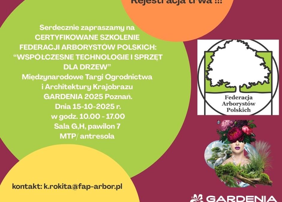 serdecznie wszystkich zapraszamy na CERTYFIKOWANE SZKOLENIE FEDERACJI ARBORYSTÓW POLSKICH: „WSPÓŁCZESNE TECHNOLOGIE I SPRZĘT DLA DRZEW” przeprowadzane w toku Międzynarodowych Targów Ogrodnictwa i Architektury Krajobrazu GARDENIA 2025, w Poznaniu, w dniu 15.10.2025 roku, w godz. 10.00-17.00.